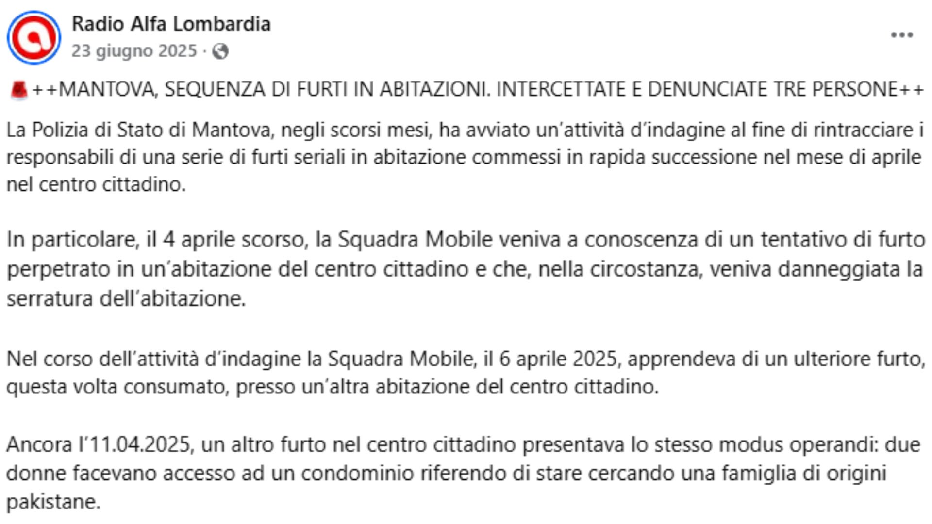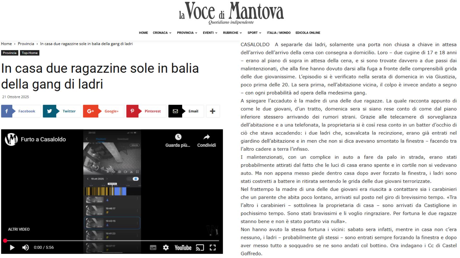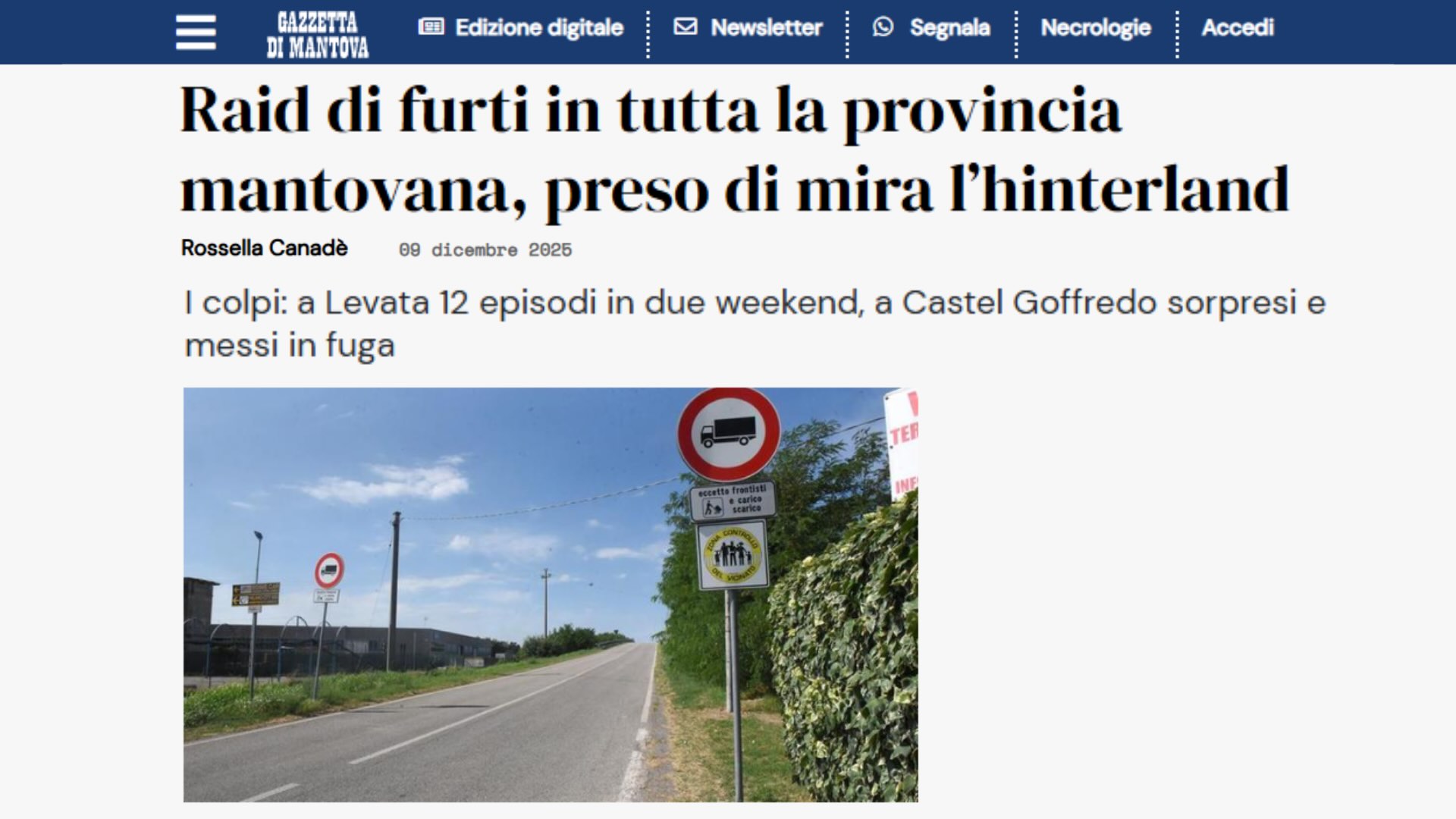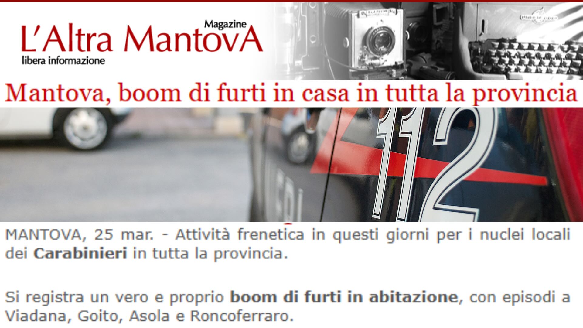 Gazzetta di Mantova: “Raid di furti in tutta la provincia mantovana, preso di mira l’hinterland”